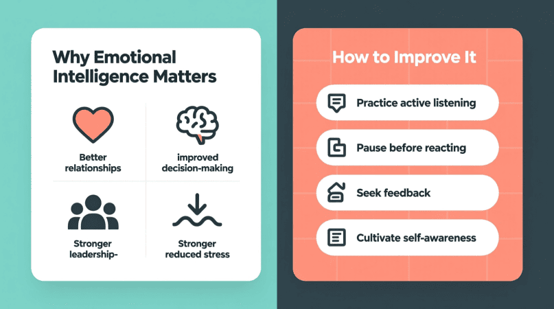 Stress lowers emotional intelligence. When you’re overwhelmed, your brain shifts into survival mode. Quick resets like deep breathing, a short walk, or mindfulness practice can calm your nervous system and help you respond thoughtfully.
